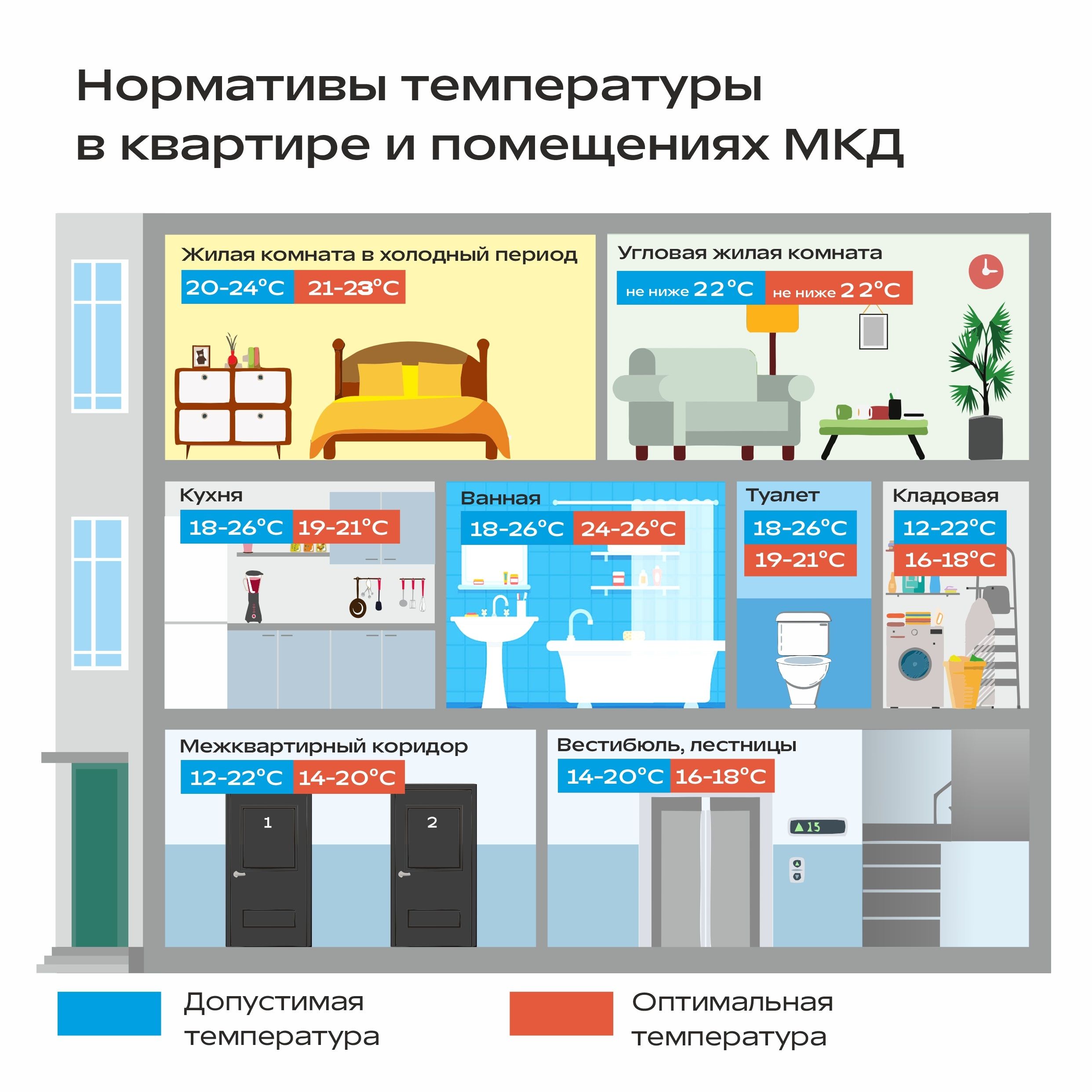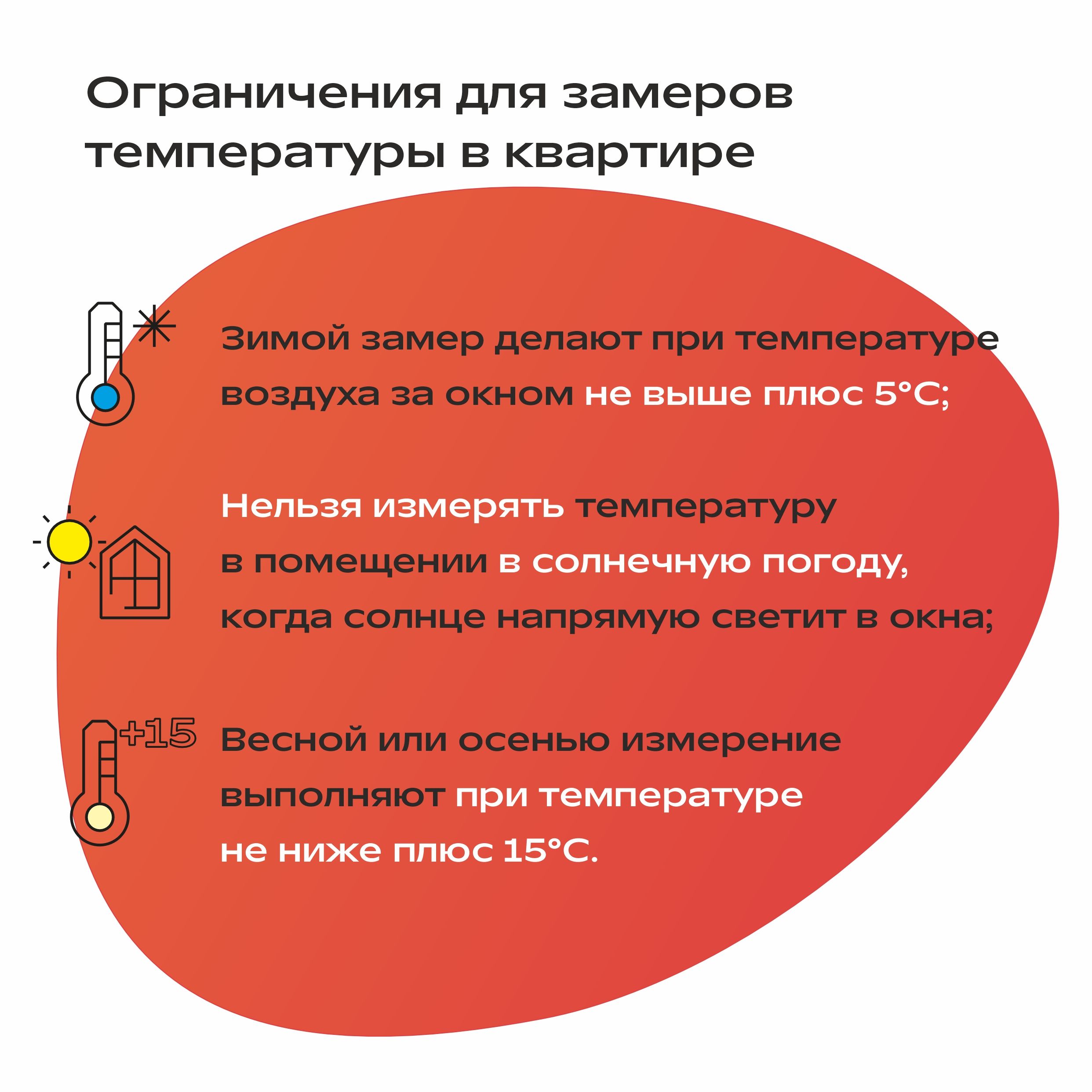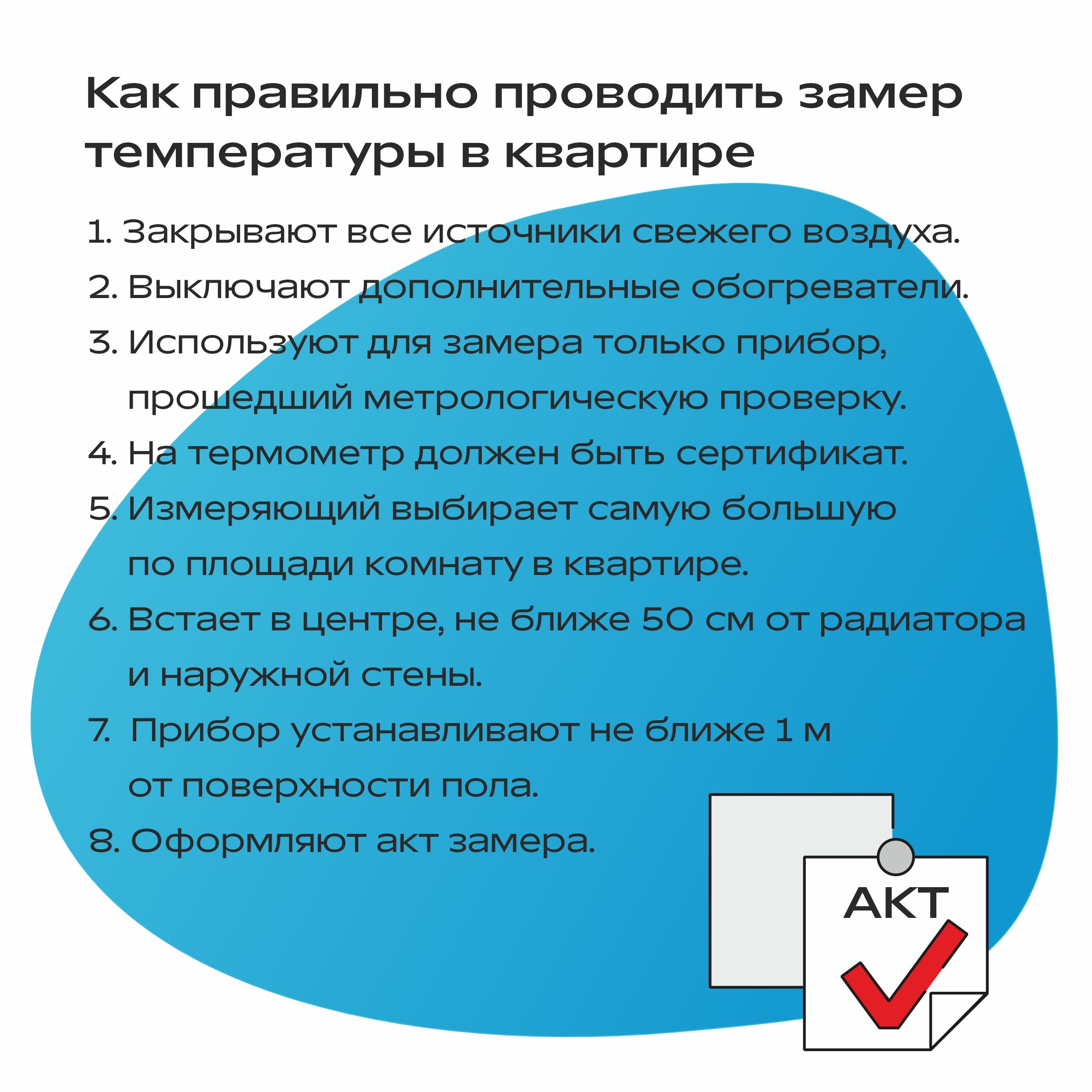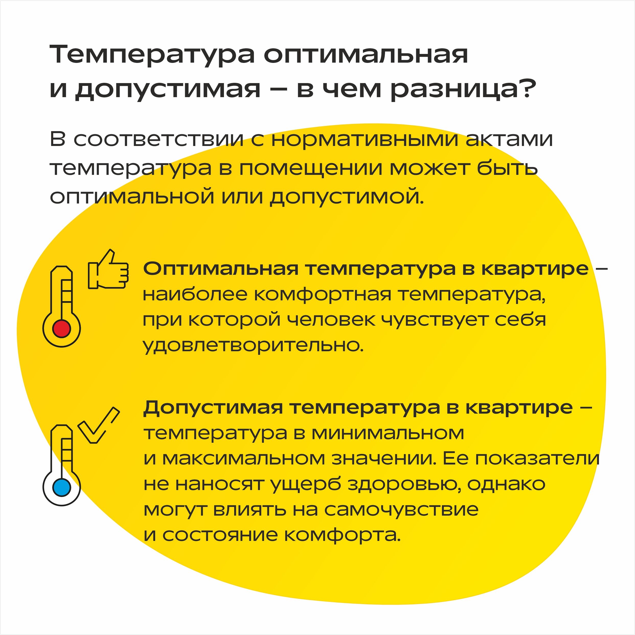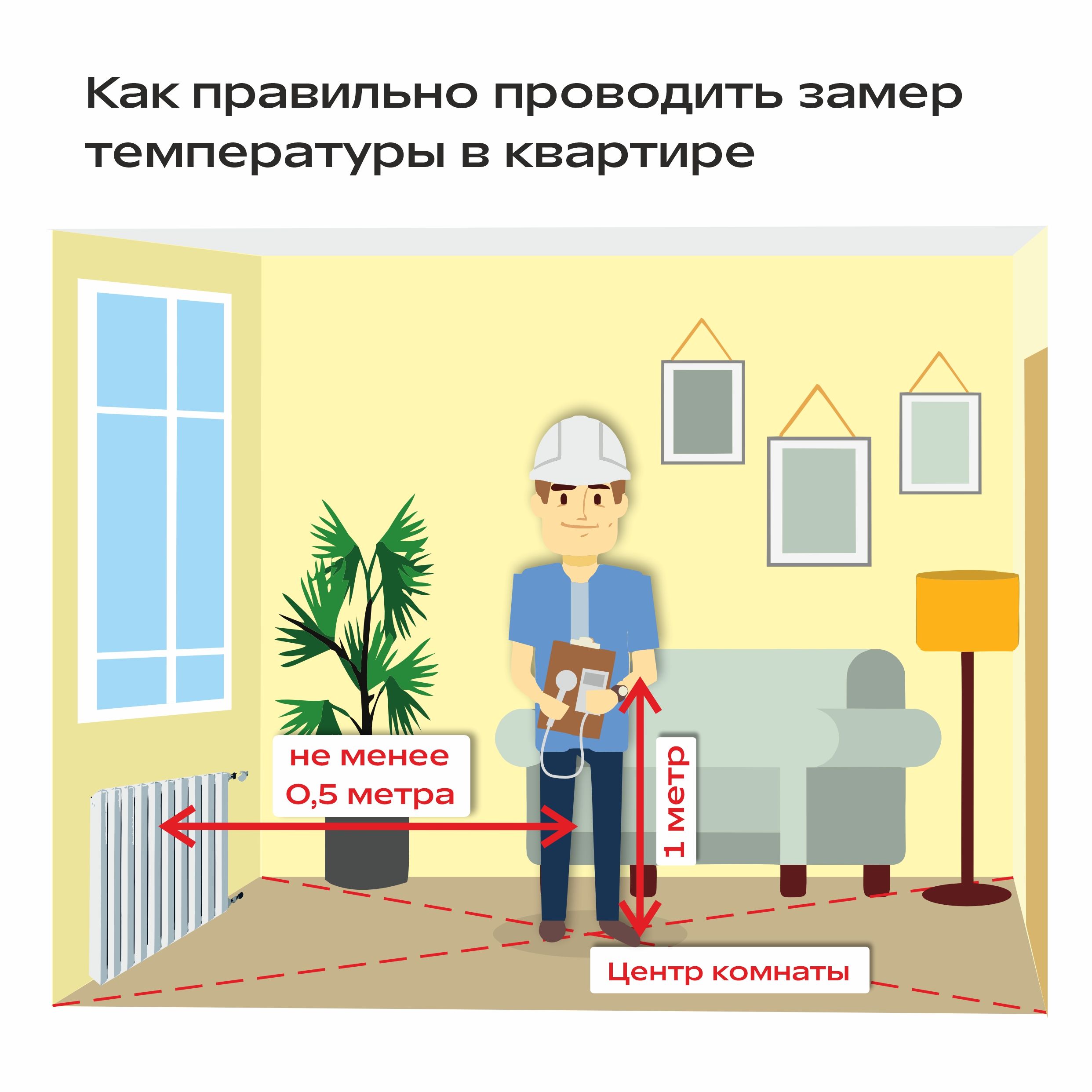 Погода за окном может быть любая — главное, чтобы в домах было тепло и комфортно. А если что-то с погодой в доме пошло не так – холодно/жарко, важно знать, от каких нормативов можно отталкиваться и как действовать, чтобы решить проблему. Мы подготовили карточки о том, как правильно проводить замеры температуры в помещении – сделать это должен сотрудник управляющей компании и/или сотрудник РСО по заявке жителя.