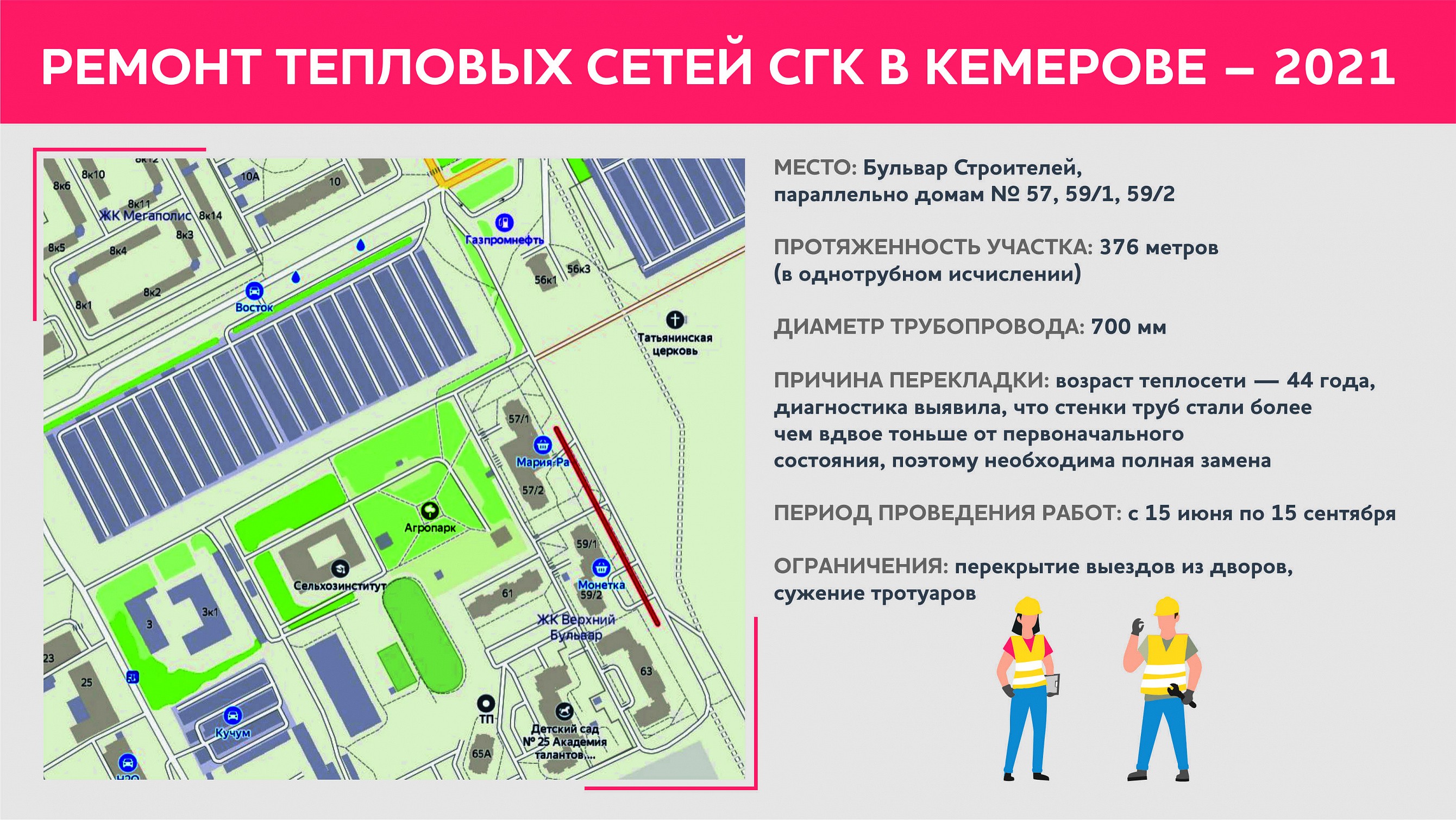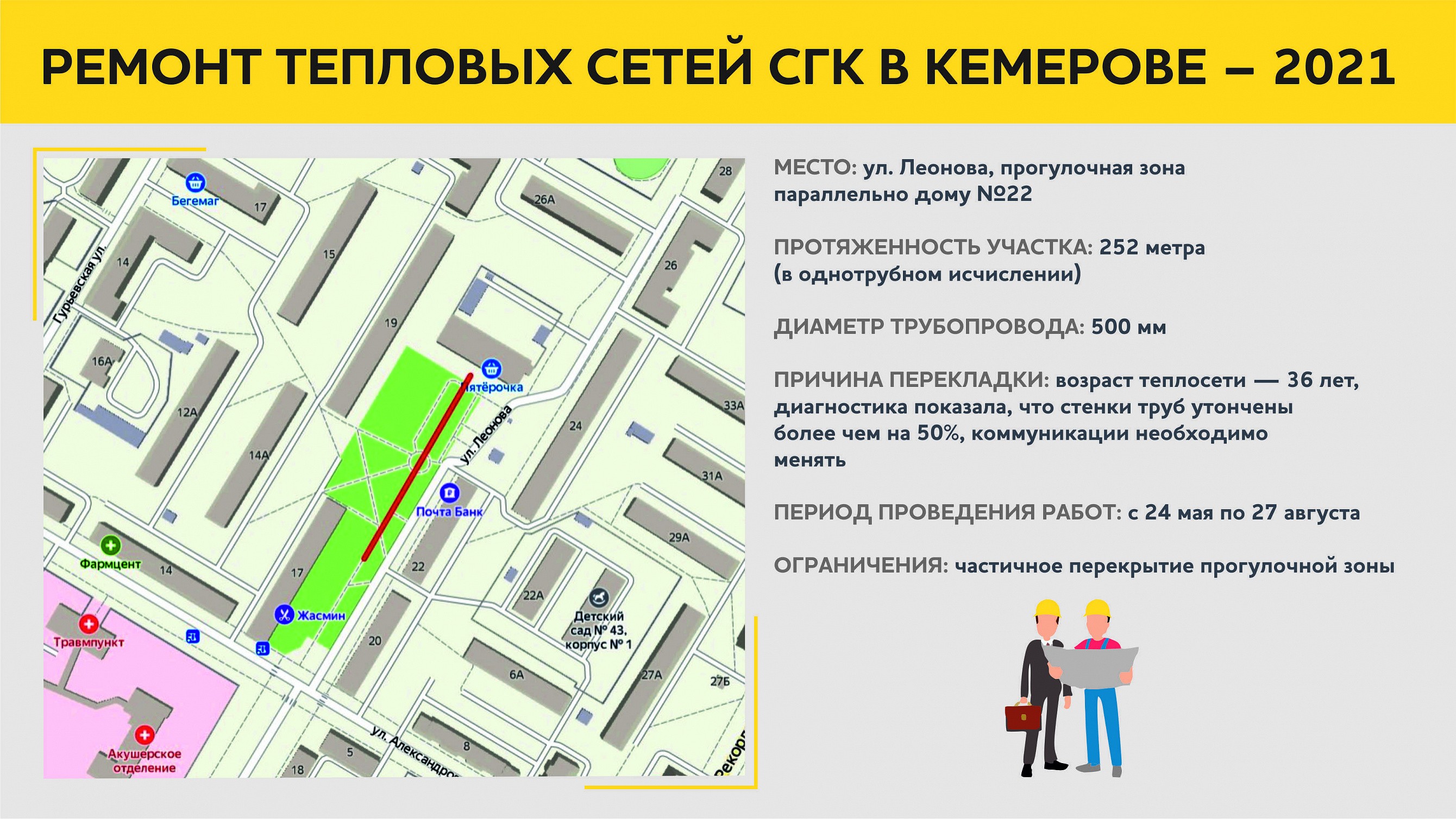 Участок тепловой магистрали на улице Леонова в эксплуатации с 1985 года и тоже требует замены. Теплосеть проложена как раз под прогулочной пешеходной зоной в центральной части Кировского района — летом, на время ремонта, проход по ней будет частично закрыт.