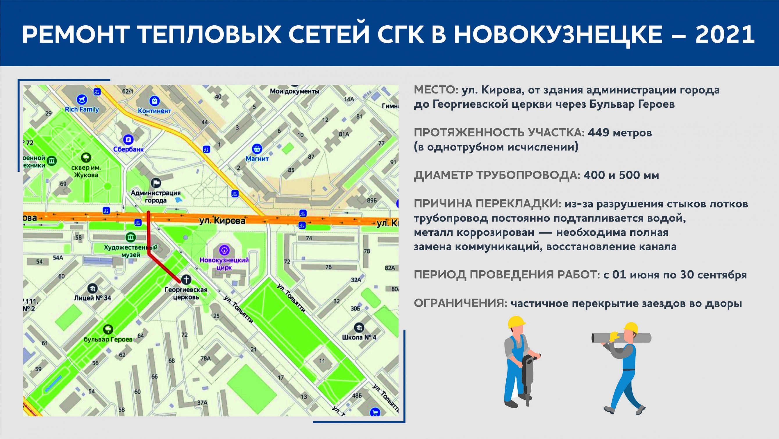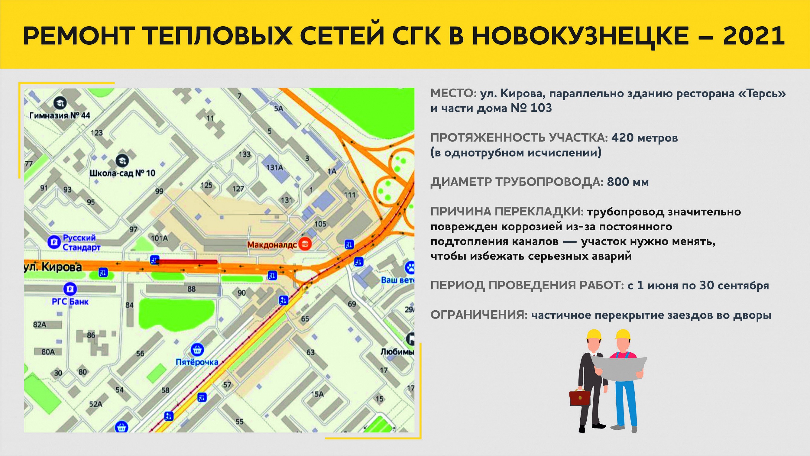 В Центральном районе Новокузнецка, на улице Кирова, заменят участок теплосети в районе автобусной остановки «Левый берег», поскольку в 2020 году на нем были зафиксированы и устранены 2 крупных дефекта.