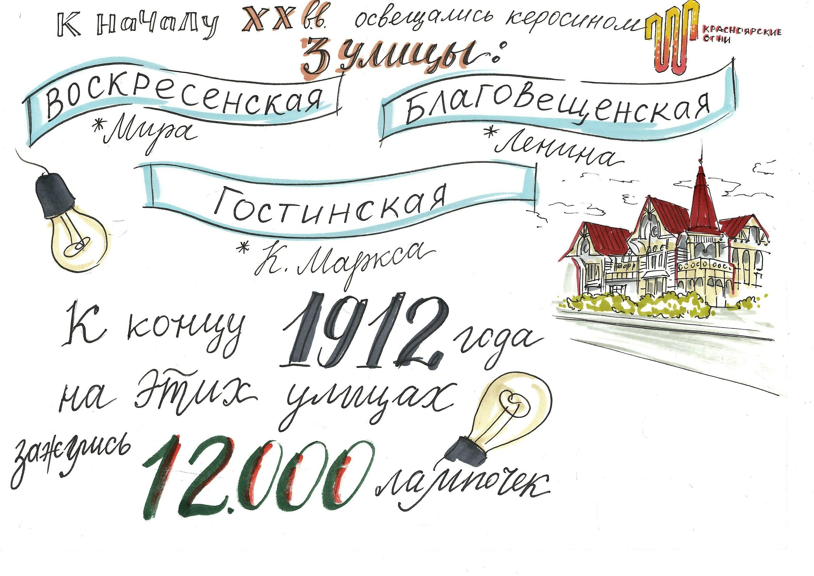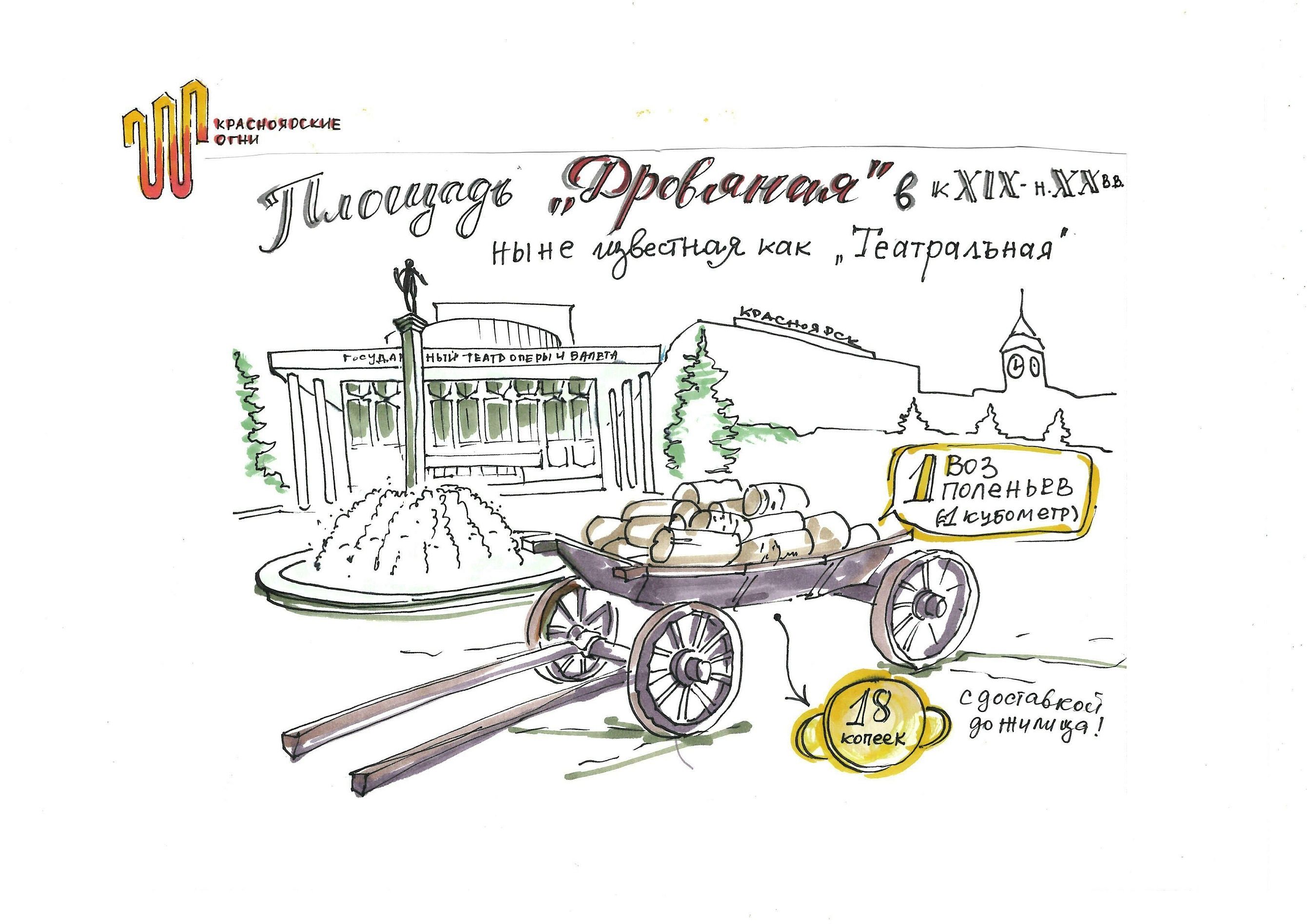 Несмотря на то, что в домах провинциального Красноярска постепенно зажигались электрические лампочки, большинство жилых домов в начале XIX-XX века были деревянными с печным отоплением. Об этом экскурсовод рассказывала на Театральной площади, именуемой в те годы Дровяной, потому что здесь шла бойкая торговля топливом.