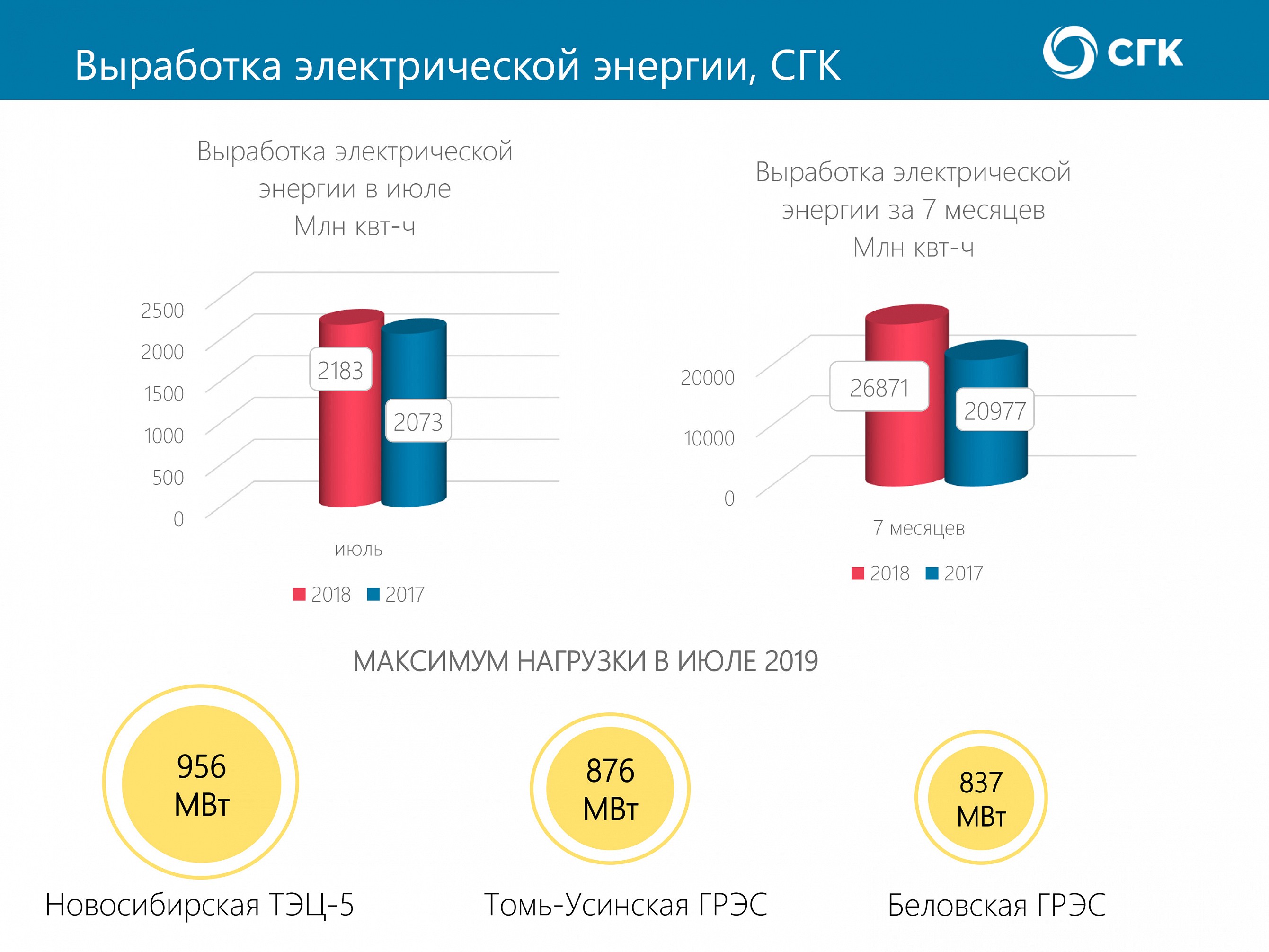 С начала года выработка СГК составила 26,9 миллиардов киловатт-часов электрической энергии, что на 28% больше, чем годом ранее. Рост производства обеспечили ТЭЦ Новосибирского региона, вошедшие в состав СГК в феврале 2019 года. В целом СГК обеспечила 22,6% выработки электроэнергии в ОЭС Сибири.