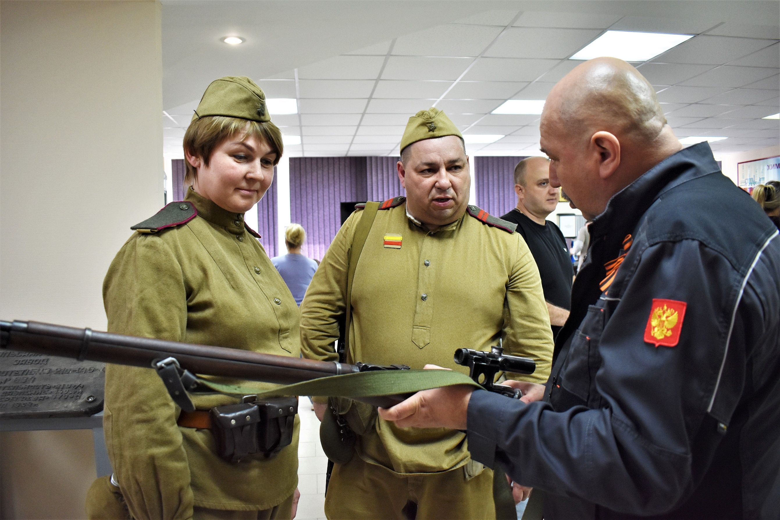 Во время музейной встречи Евгений и Елена подробно рассказали мальчишкам и девчонкам о представленных на встрече образцах советского арсенала — пулемете ППШ-СХ и винтовке Мосина. Также все желающие могли подержать оружие в руках.