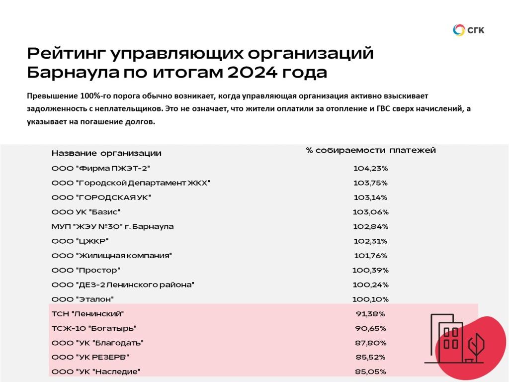 Уже второй год подряд в безусловных лидерах барнаульского рейтинга числится ООО «Фирма ПЖЭТ-2». Имеет на обслуживании 43 многоквартирных дома (МКД), собираемость в 2024 году достигла 104,2%.