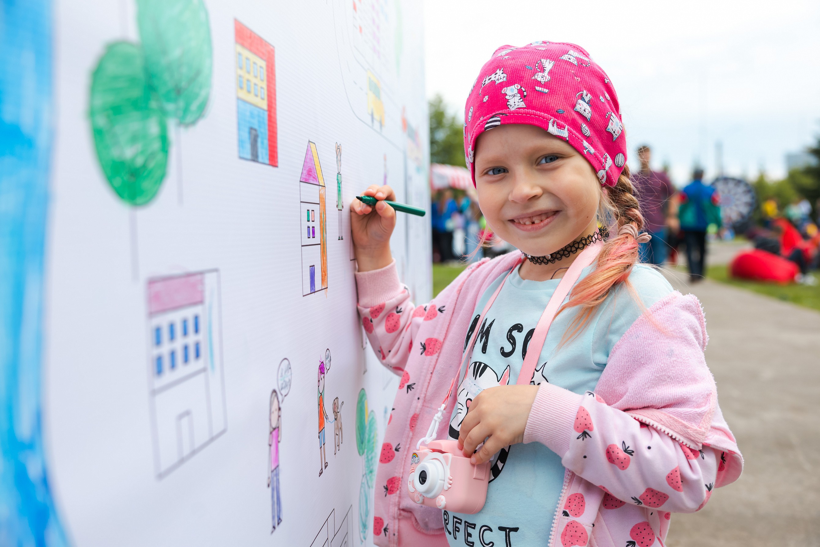 Дети и взрослые разрисовывали карандашами гигантскую раскраску. Так же как тепло и свет преображают нашу жизнь, с помощью цвета город на большом полотне из черно-белого превращался в радужный и жизнерадостный.