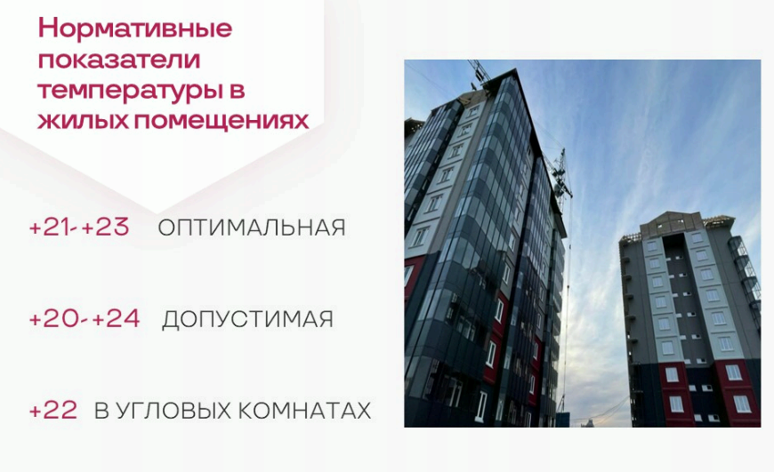 — Дело в том, что повышение температуры теплоносителя в системе зависит от погоды за окном: чем холоднее на улице, тем выше параметры задают диспетчеры тепловых сетей для теплоисточников. Но даже при сильных морозах батарея в квартире не должна быть слишком горячей, ориентироваться нужно на температуру воздуха в помещениях. Насколько она комфортна либо нет. Напоминаем нормативные параметры, они могут быть снижены не более, чем на 3℃ и только в ночное время с 00:00 до 05:00.