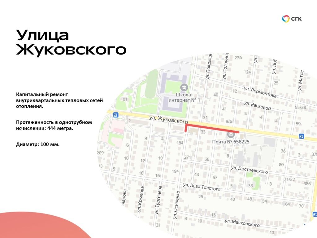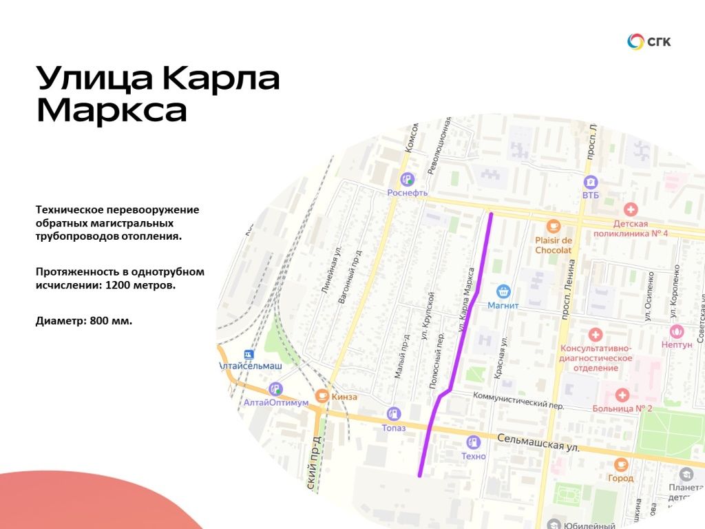 1,2 км магистральных трубопроводов коснется масштабная модернизация. На эти цели СГК инвестирует 157 млн рублей. Тепловые сети, которые обеспечивают теплом более 73,5 тыс. потребителей, не просто будут обновлены, а реконструированы. Модернизируют теплосети, проложенные параллельно улице Карла Маркса от Южной тепловой станции до проспекта Рубцовского.